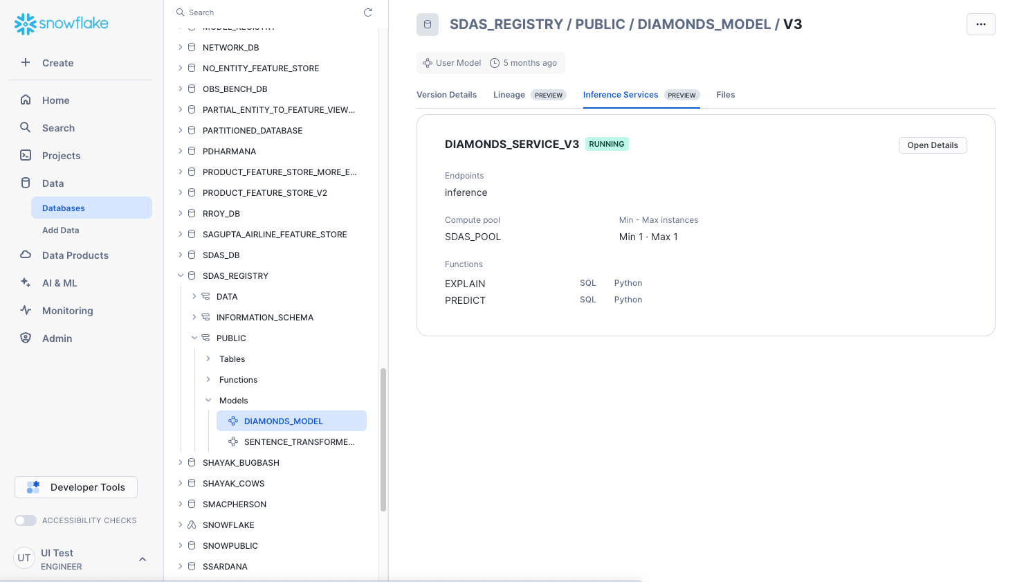 You can see the model inference services created with SPCS Model Serving in the Model Registry UI. The main model listing page shows the status of inference services created for any model.