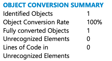 Explanation: In this example we have 3 statements, all of them have been identified as an object, but just the table1, and the view1 have a 100% conversion rate. The table3 has an error warning meaning that the conversion of this table is not 100%, that’s why just 2 of the 3 statements are counted as fully converted objects.