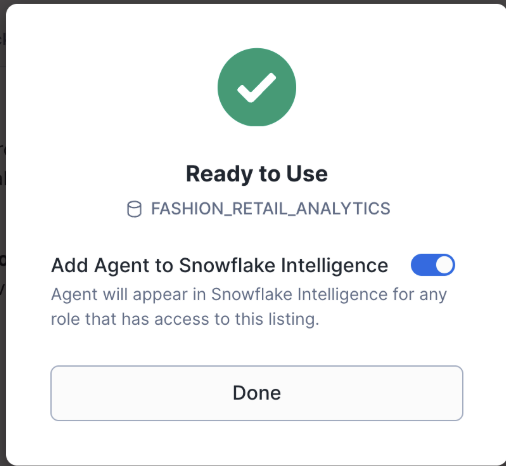 When you get a listing that contains a shared Cortex Agent, you can add the agent to Snowflake Intelligence. To do so, keep the Add to Snowflake Intelligence toggle enabled when you get the listing. This makes the shared agent available as a data source within Snowflake Intelligence.