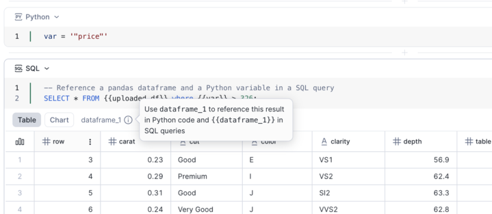 The result of a SQL cell provides a DataFrame pointer called dataframe_1. You can reference it in another SQL query: