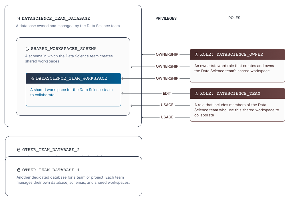 Shared workspaces are created as schema-level objects within a standard database and follow Snowflake’s existing role-based access control (RBAC) model.