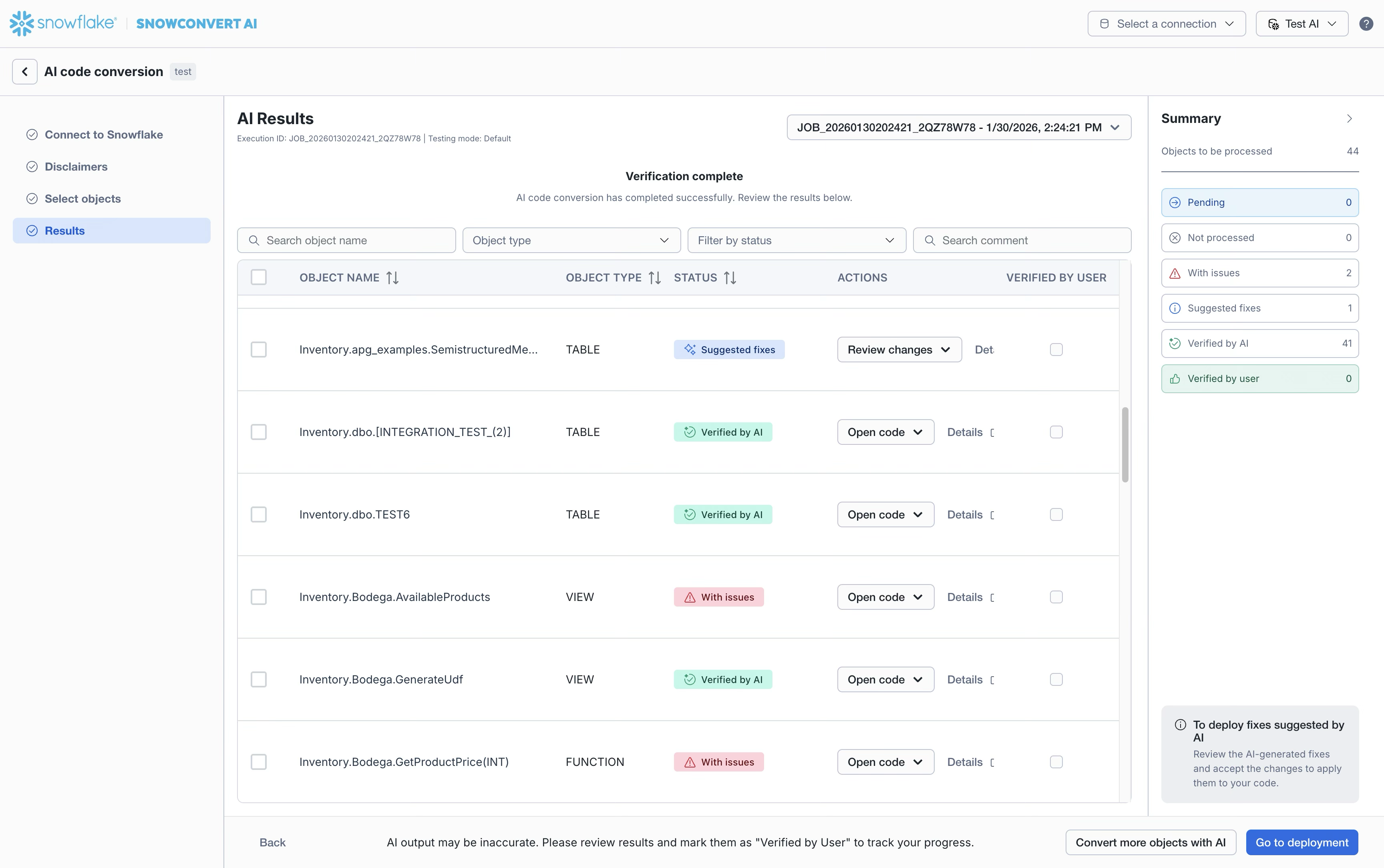 Suggested fixes: Indicates that AI code conversion proposed code fixes for the object. The fixes need user review before being considered ready for deployment to Snowflake.
