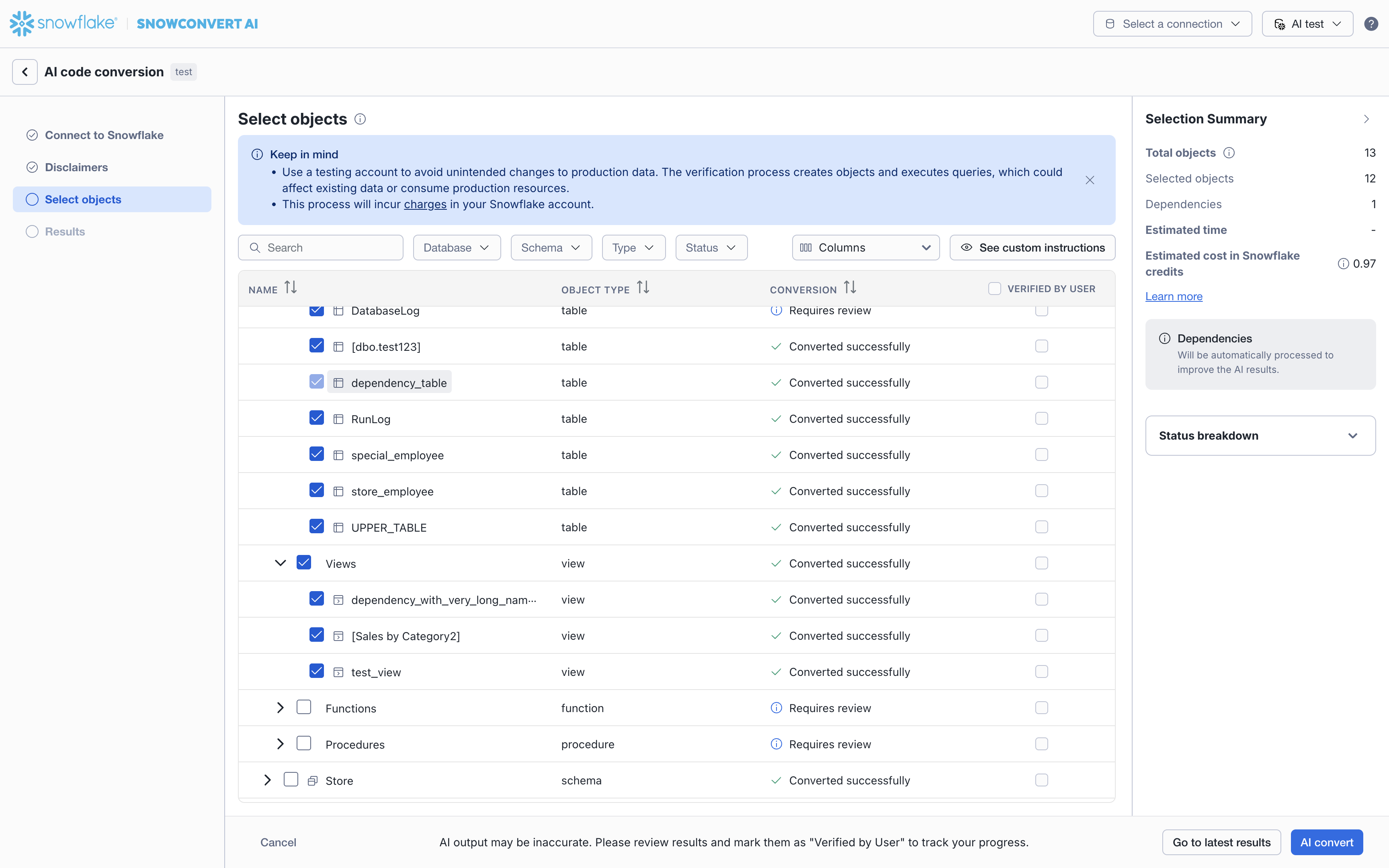 Select AI Convert. SnowConvert AI connects to your Snowflake account, where it relies on Cortex AI Functions to review your code and suggest resolutions to any problems. AI code conversion might take a few minutes to start, and it might run for several minutes or hours depending on the complexity of the code being verified.