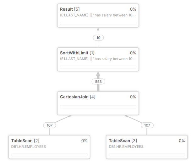 In this section, we will see how a band join is executed in Snowflake and the execution plan is very similar to the improved version of Oracle.