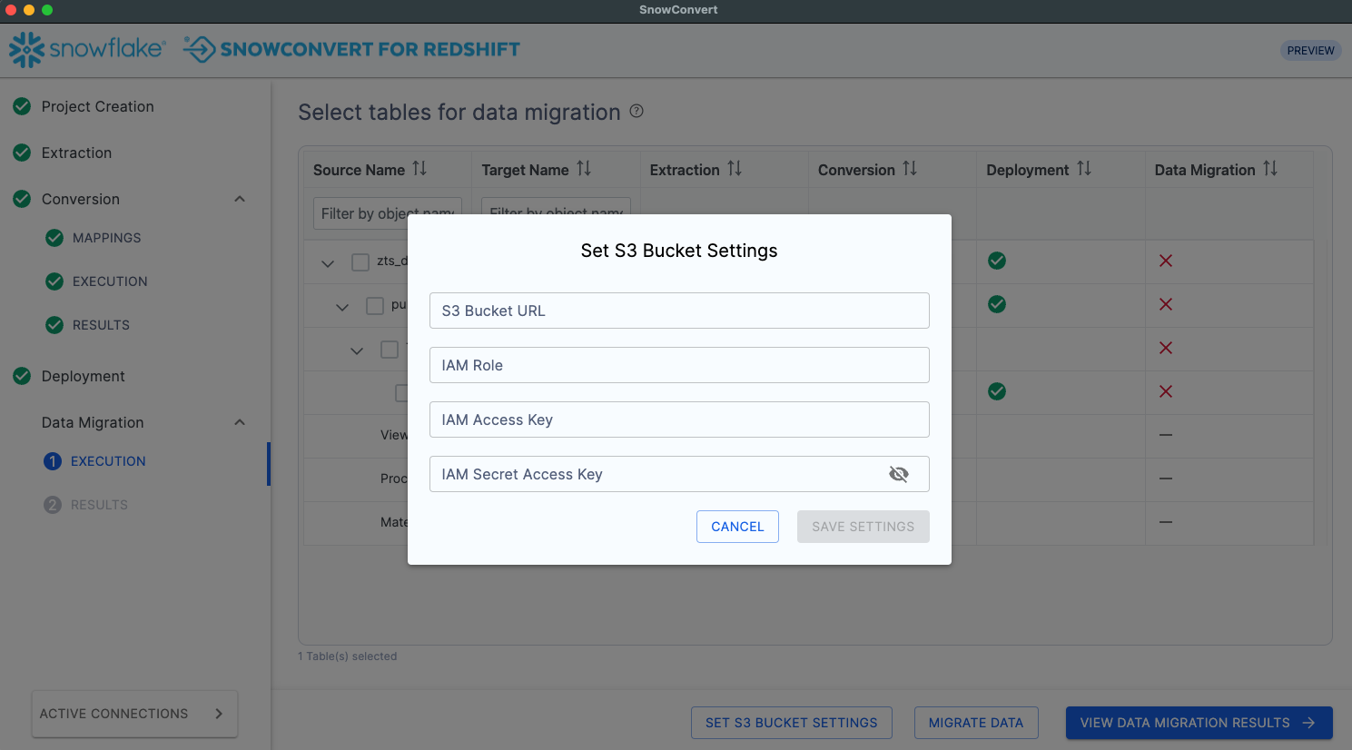 Initiate data migration by clicking "Migrate Data". This starts the process of unloading data to S3 and copying it to Snowflake tables.