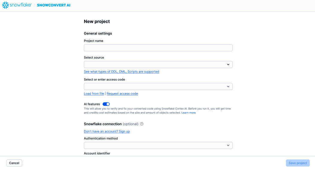 SnowConvert AI manages migrations by using SnowConvert AI projects. A SnowConvert AI project contains metadata about migrating a data set into Snowflake, such as the source database platform, input files, and output location. You can save and reuse these settings for multiple conversion runs.