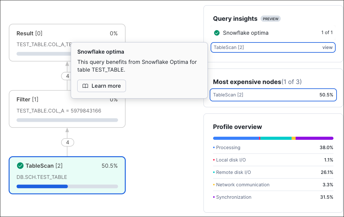 下图示例展示了 Query insights 窗格,指示 Snowflake Optima 已被使用: