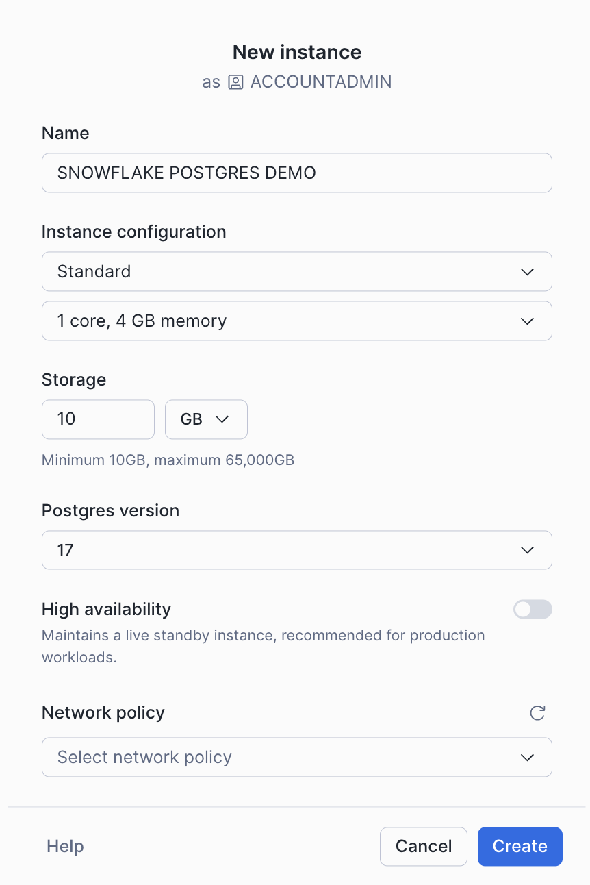 您可以通过使用 Snowsight 或执行 Snowflake SQL 语句来创建 Snowflake Postgres 实例。 实例的规格大小、存储容量及 Postgres 主要版本可在创建实例时进行配置。 网络策略也可在实例创建时应用于实例。