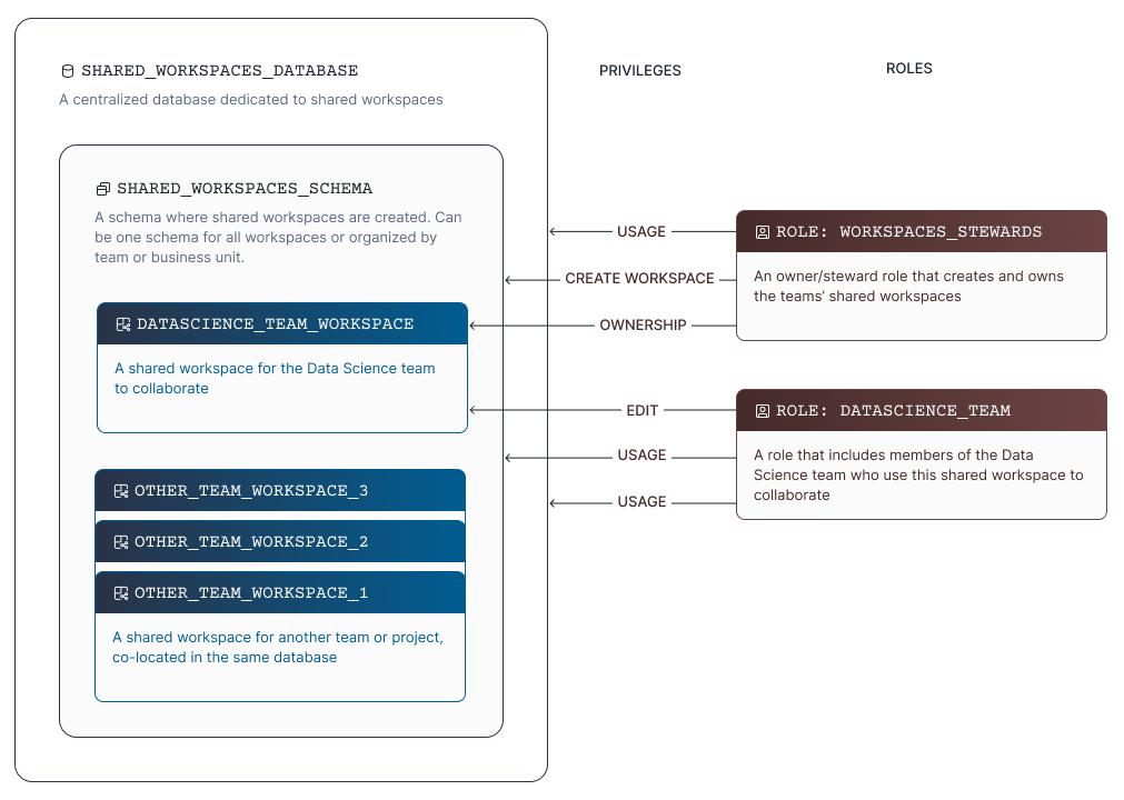 共享工作区在标准数据库中作为架构级对象创建,并遵循 Snowflake 现有的基于角色访问控制 (RBAC) 模型。